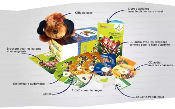 Apprendre le russe pour enfants avec le kit PetraLingua dvd cd livres pour apprendre une nouvelle langue en s’amusant avec les vidéos pleines de couleurs, en écoutant les chansons des cours, en pratiquant tout ce qu’il a appris dans le livre d’activités et en jouant avec les cartes en russe et la peluche.